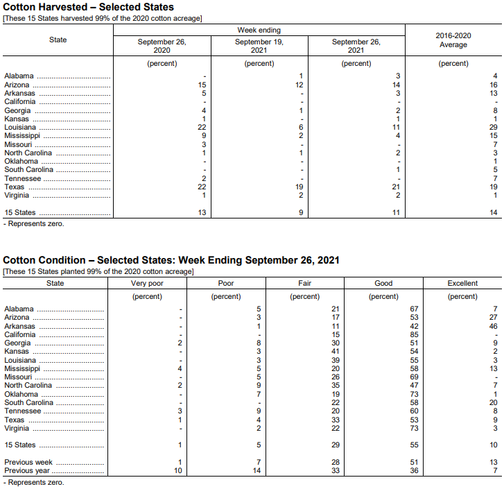美國農(nóng)業(yè)部9月27日發(fā)布的美國棉花生長報告顯示,截至9月26日當(dāng)周,美棉吐絮率為60%,前周為48%,去年同期為65%,五年均值為64%。美棉收割率為11%,前周為9%,去年同期為13%,五年均值為14%。美棉生長優(yōu)良率為65%,前周為64%,去年同期為43%。