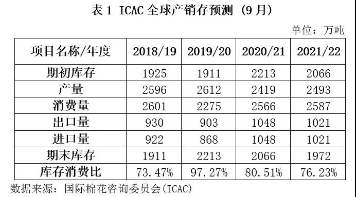 國際棉花咨詢委員會(ICAC)9月全球棉花產(chǎn)銷存預測數(shù)據(jù)顯示,2021/22年度全球棉花期初庫存2066萬噸,環(huán)比下降32萬噸,降幅1.53%,同比下降147萬噸,降幅6.64%;全球棉花產(chǎn)量2493萬噸,環(huán)比下降12萬噸,降幅0.48%,同比增加74萬噸,增幅3.06%;消費量2587噸,環(huán)比增加9萬噸,增幅0.35%,同比增加21萬噸,增幅0.82%;期末庫存1972萬噸,環(huán)比下降93萬噸,降幅4.55%,同比下降53萬噸,降幅2.62%;全球棉花產(chǎn)不足需94萬噸,較2020/21年度收窄53萬噸;全球棉花期末庫存消費比為76.23%,較2020/21年下降4.29個百分點。