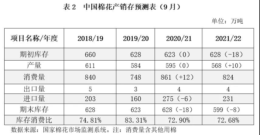 基于相關(guān)專題調(diào)查和對國內(nèi)外經(jīng)濟環(huán)境及市場狀況的分析,2021年9月國家棉花市場監(jiān)測系統(tǒng)對2020/21年度和2021/22年度國內(nèi)棉花產(chǎn)銷存調(diào)整如下: