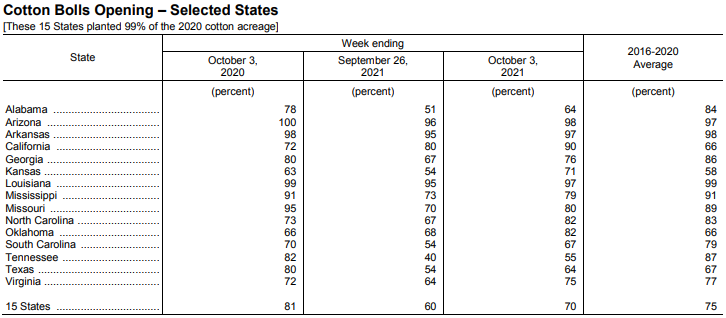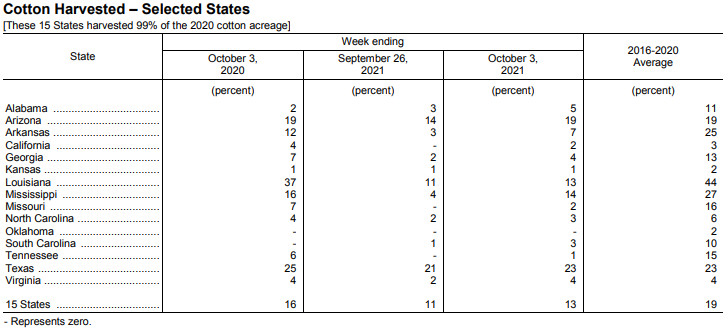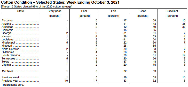 美國農(nóng)業(yè)部10月4日發(fā)布的美國棉花生長報告顯示,截至10月3日當(dāng)周,美棉吐絮率為70%,前周為60%,去年同期為81%,五年均值為75%。美棉收割率為13%,前周為11%,去年同期為16%,五年均值為19%。美棉生長優(yōu)良率為62%,前周為65%,去年同期為40%。