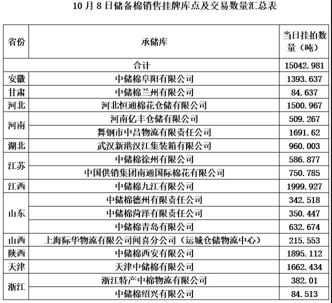 中國(guó)儲(chǔ)備棉管理有限公司定于10月8日通過全國(guó)棉花交易市場(chǎng)上市銷售中央儲(chǔ)備棉重量15042.981噸,共70捆。具體庫(kù)點(diǎn)及數(shù)量見下表。