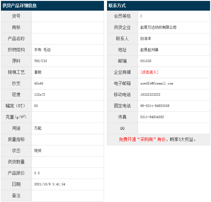 10月8日,趙縣萬(wàn)達(dá)紡織有限公司滌棉平布T65/C35 45x45 133x72 63" 毛邊,報(bào)價(jià)為5.5元/米,實(shí)際成交價(jià)以協(xié)商為準(zhǔn)。[點(diǎn)擊查看詳情]