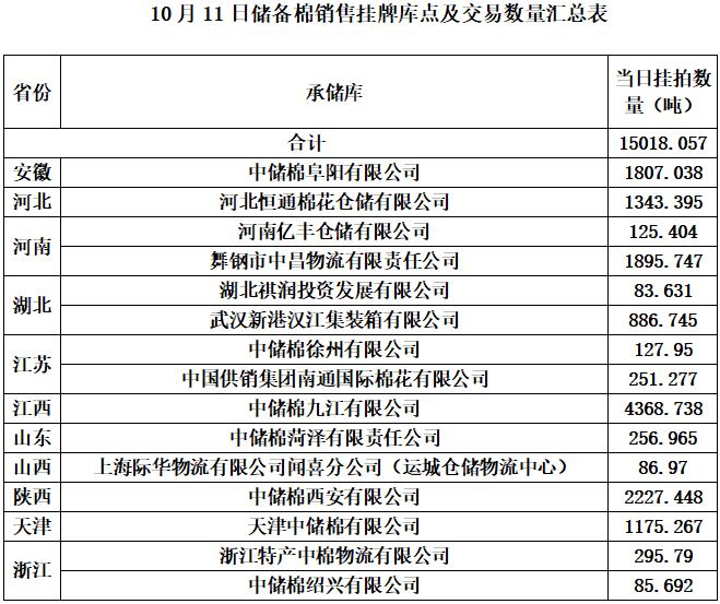 中國(guó)儲(chǔ)備棉管理有限公司定于10月8日通過全國(guó)棉花交易市場(chǎng)上市銷售中央儲(chǔ)備棉重量15018.057噸,共74捆。具體庫點(diǎn)及數(shù)量見下表。