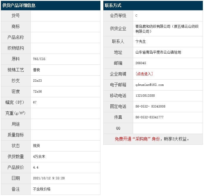 10月12日,青島君和紡織有限公司(原五棉云山紡織有限公司)滌棉布T65/C35 23x23 72x56 67",報價為4.4元/米,實際成交價以協(xié)商為準(zhǔn)。[點擊查看詳情]