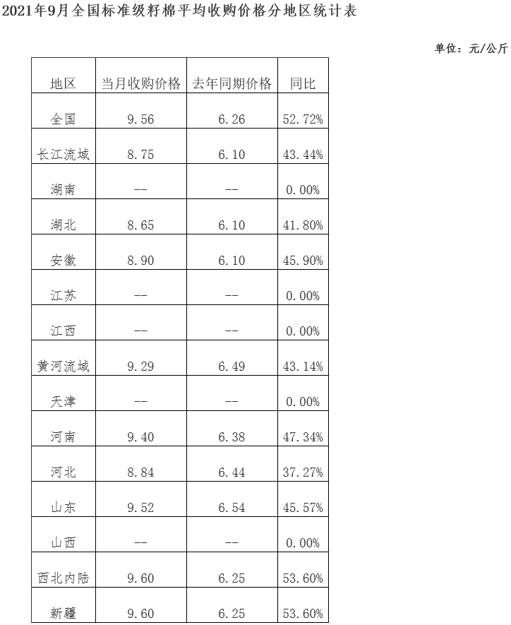 據(jù)統(tǒng)計,截止到9月30日,全國400型棉花加工企業(yè)3128級籽棉平均收購價9.56元/公斤,同比上漲52.72%。新疆籽棉收購價9.6元/公斤,同比上漲53.60%;長江流域籽棉收購價8.75元/公斤,同比上漲43.44%;黃河流域收購價9.29元/公斤,同比上漲43.14%。