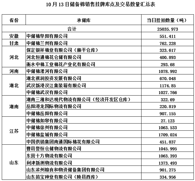 中國(guó)儲(chǔ)備棉管理有限公司定于10月13日通過(guò)全國(guó)棉花交易市場(chǎng)上市銷售中央儲(chǔ)備棉重量25035.973噸,共112捆。具體庫(kù)點(diǎn)及數(shù)量見(jiàn)下表。