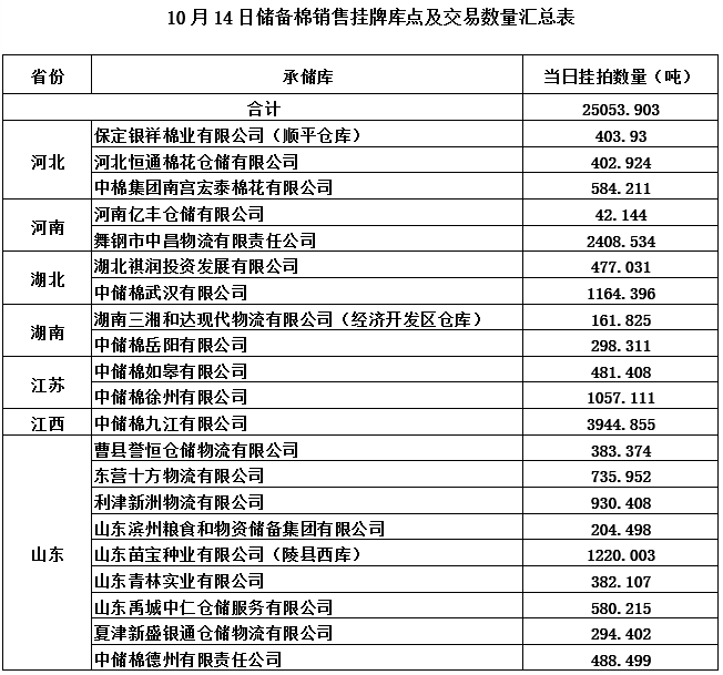 中國儲備棉管理有限公司定于10月14日通過全國棉花交易市場上市銷售中央儲備棉重量25053.903噸,共127捆。具體庫點及數(shù)量見下表。