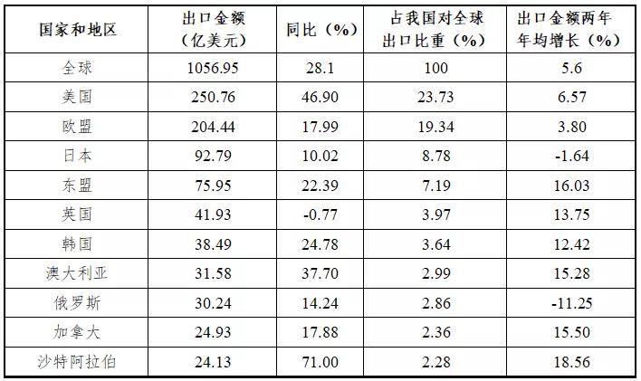 表1.2021年1-8月我國(guó)對(duì)部分國(guó)家和地區(qū)出口服裝情況