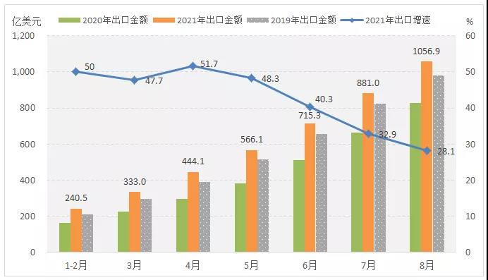 在國(guó)際市場(chǎng)需求回暖和海外訂單回流等因素的拉動(dòng)下,我國(guó)服裝出口延續(xù)2020年下半年以來快速恢復(fù)態(tài)勢(shì)保持大幅增長(zhǎng)。據(jù)中國(guó)海關(guān)數(shù)據(jù),2021年1-8月我國(guó)累計(jì)完成服裝及衣著附件出口1056.95億美元,同比增長(zhǎng)28.1%,2年平均增長(zhǎng)5.6%。服裝出口增速逐月放緩,8月單月增幅為8.7%,市場(chǎng)需求增長(zhǎng)速度逐步回歸常態(tài)化。