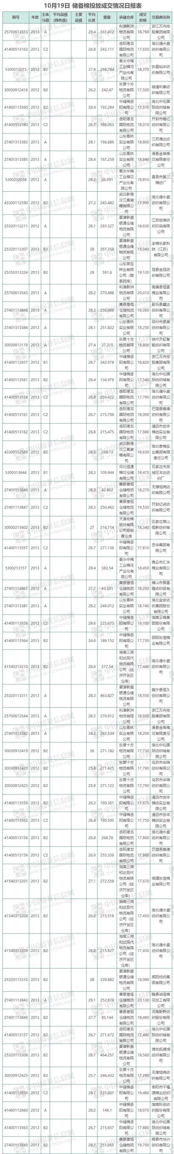 10月19日儲(chǔ)備棉投放銷售資源30047.776噸,實(shí)際成交13409.523噸,成交率44.63%,成交均價(jià)18387元/噸,較18日下跌501元/噸,折3128價(jià)格20182元/噸,較18日下跌408元/噸。