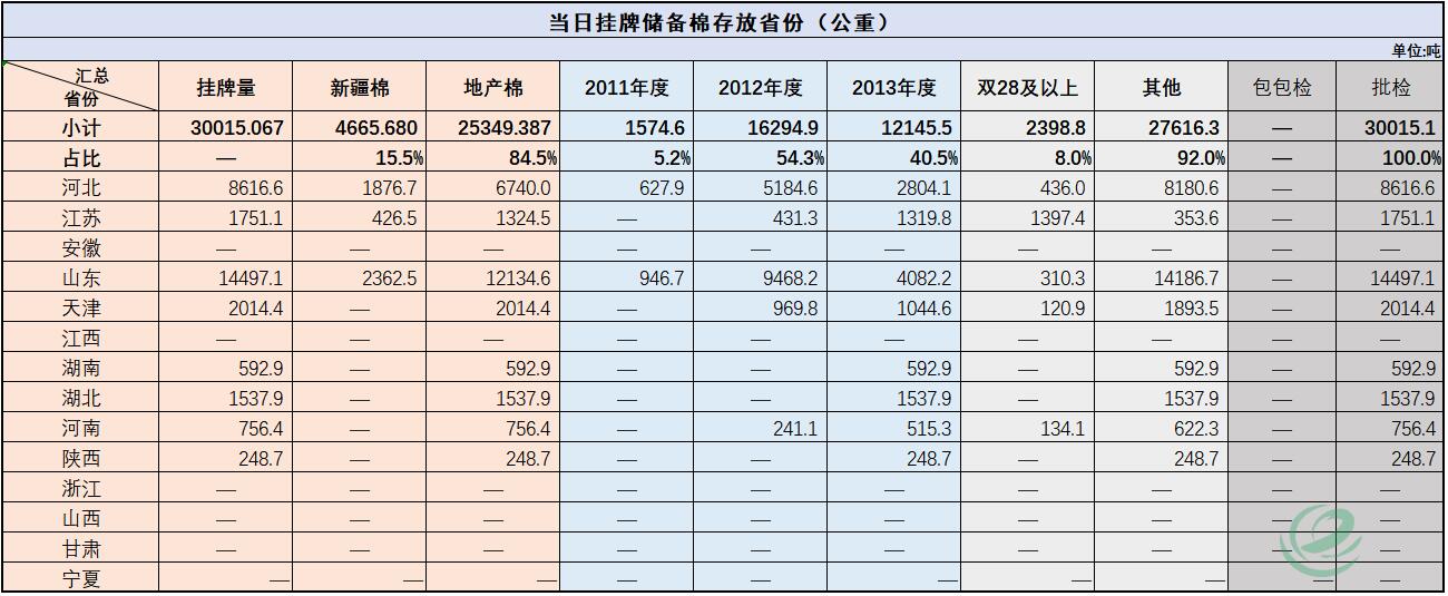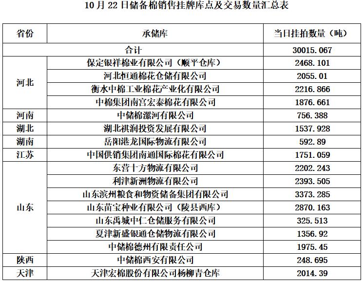 中國儲備棉管理有限公司定于10月22日通過全國棉花交易市場上市銷售中央儲備棉重量30015.067噸,共116捆。具體庫點及數(shù)量見下表。