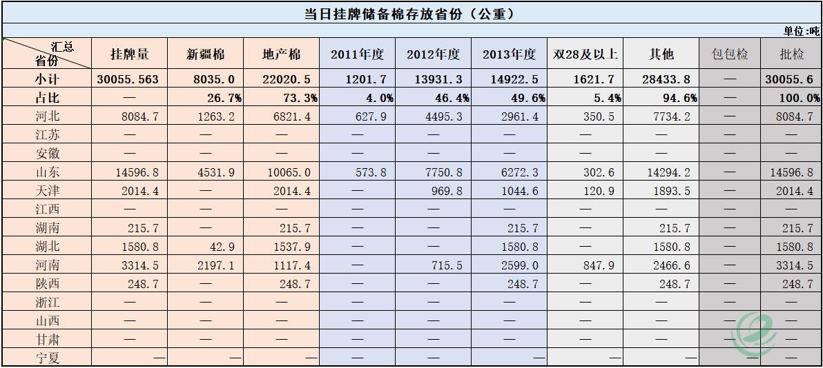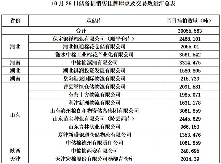 中國儲備棉管理有限公司定于10月26日通過全國棉花交易市場上市銷售中央儲備棉重量30055.563噸,共111捆。具體庫點及數(shù)量見下表。