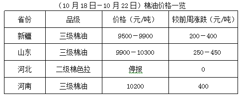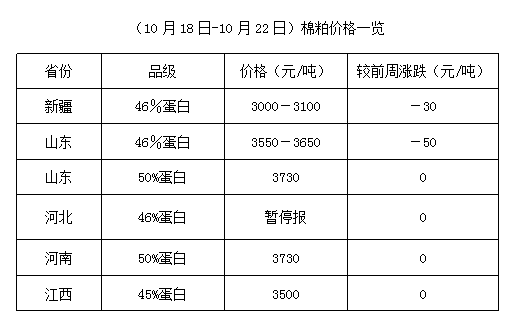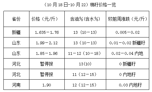 上周(10月18-22日),新疆地區(qū)籽棉收購價雖有所下降,但整體收購量有限,軋花廠開工率一般,又因新疆到內(nèi)地運輸費用大漲,共同支撐棉籽行情。豆油期貨沖高支撐棉油行情,棉短絨報價跟漲,加之油棉廠復工率有限,產(chǎn)品庫存多無壓力,市場持價動能仍強。但當前高位風險度提高,油棉廠宜隨加工隨出貨,減少庫存風險。