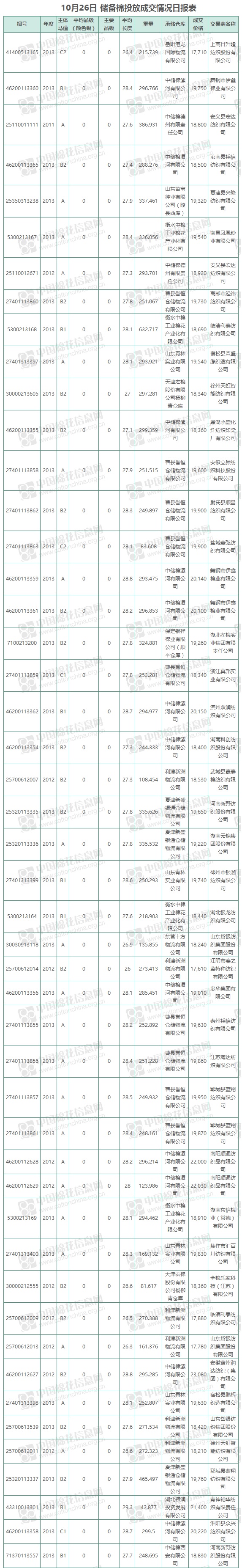 10月26日儲(chǔ)備棉投放銷售資源30055.56噸,實(shí)際成交12713.53噸,成交率42.30%,成交均價(jià)19332元/噸,較25日上漲737元/噸,折3128價(jià)格21017元/噸,較25日上漲554元/噸。
