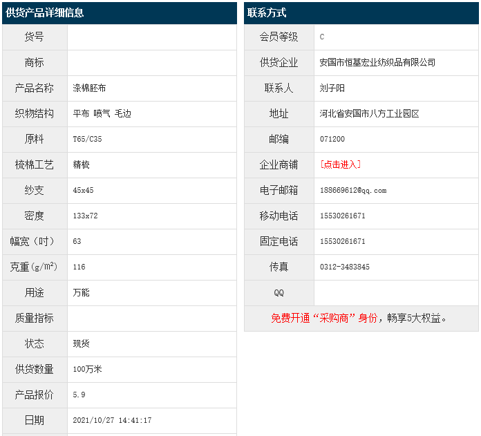 10月27日,安國恒基宏業(yè)紡織品有限公司滌棉平布T65/JC35 45x45 133x72 63" 116g/㎡ 噴氣 毛邊,報(bào)價(jià)為5.9元/米,實(shí)際成交價(jià)以協(xié)商為準(zhǔn)。[點(diǎn)擊查看詳情]