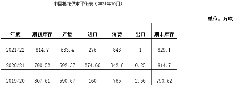 據(jù)中國棉花協(xié)會(huì)預(yù)測(cè),2021/22年度全國棉花總產(chǎn)583.4萬噸,同比下降1.52%;消費(fèi)量和進(jìn)口量保持穩(wěn)定,分別843萬噸和275萬噸;期末庫存相應(yīng)調(diào)整為829.1萬噸,同比增長1.8%。
