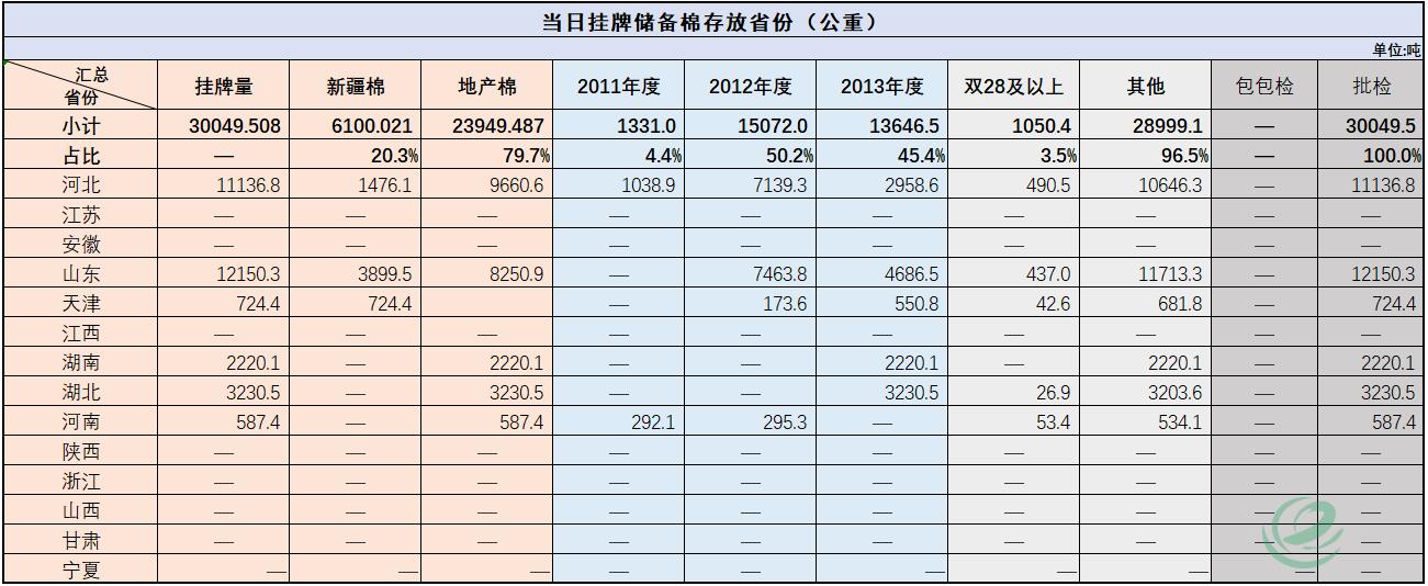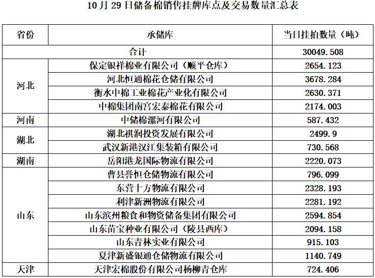 中國儲備棉管理有限公司定于10月29日通過全國棉花交易市場上市銷售中央儲備棉重量30049.508噸,共111捆。具體庫點及數(shù)量見下表。