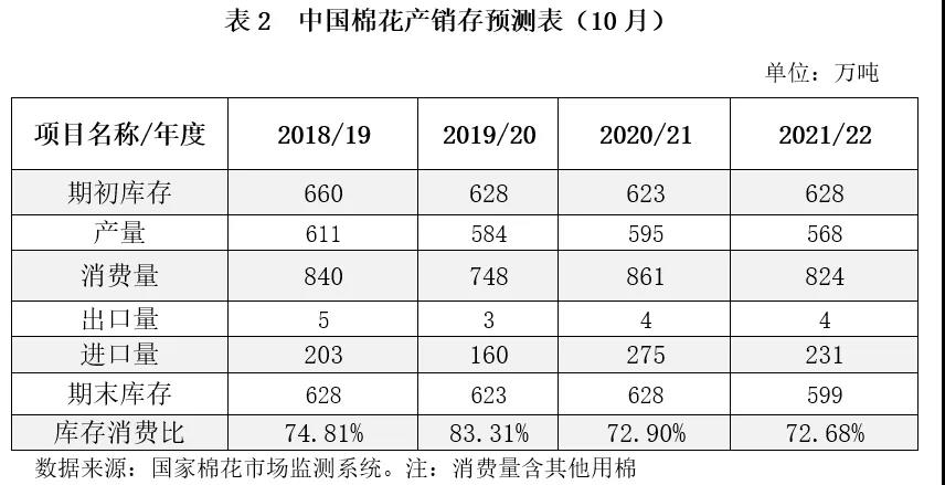 基于相關(guān)專題調(diào)查和對(duì)國內(nèi)外經(jīng)濟(jì)環(huán)境及市場狀況的分析,本期國家棉花市場監(jiān)測系統(tǒng)對(duì)2020/21年度和2021/22年度國內(nèi)棉花產(chǎn)銷存預(yù)測延續(xù)上月觀點(diǎn):