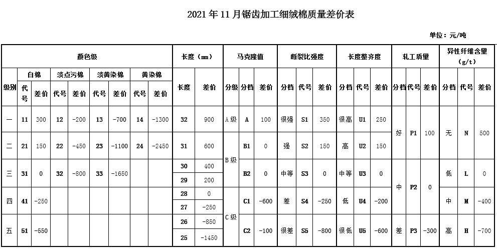 依據(jù)2021年10月的棉花公檢質(zhì)量數(shù)據(jù)、中國棉花協(xié)會棉花質(zhì)量價(jià)差自動生成系統(tǒng)采集的棉花加工企業(yè)銷售成交價(jià)、紡織企業(yè)監(jiān)測點(diǎn)的采集數(shù)據(jù)及當(dāng)月的中國棉花價(jià)格指數(shù),2021年11月鋸齒加工細(xì)絨棉質(zhì)量差價(jià)調(diào)整數(shù)據(jù)據(jù)此生成,現(xiàn)做出如下調(diào)整(單位:元/噸):