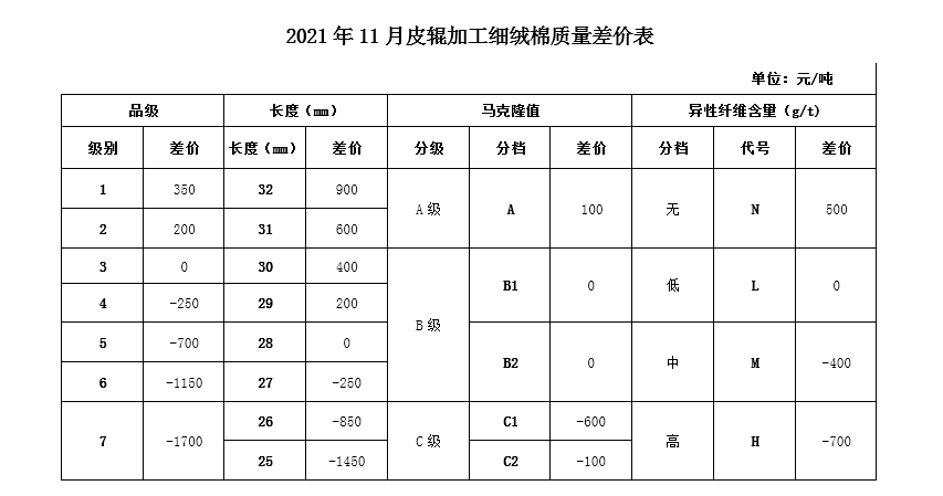 根據(jù)《中國棉花協(xié)會國產(chǎn)棉質(zhì)量差價(jià)表管理辦法》規(guī)定,現(xiàn)正式發(fā)布2021年11月《鋸齒加工細(xì)絨棉質(zhì)量差價(jià)表》、《皮輥加工細(xì)絨棉質(zhì)量差價(jià)表》和《長絨棉質(zhì)量差價(jià)表》(單位:元/噸)。