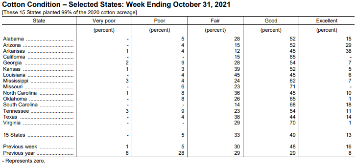 美國(guó)農(nóng)業(yè)部11月1日發(fā)布的美國(guó)棉花生長(zhǎng)報(bào)告顯示,截至10月31日當(dāng)周,美棉吐絮率為94%,前周為91%,去年同期為98%,五年均值為95%。美棉收割率為45%,前周為35%,去年同期為51%,五年均值為48%。美棉生長(zhǎng)優(yōu)良率為62%,前周為64%,去年同期為37%。
