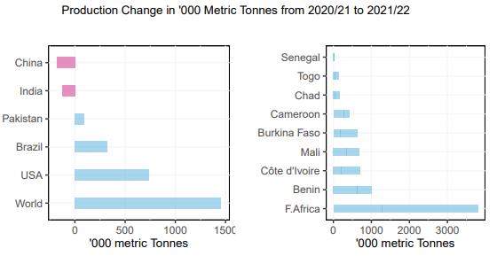 在非洲,尤其是西非,情況略有不同。所有西非國家均報(bào)告產(chǎn)量增加,其中貝寧、馬里增幅最大,分別38.2萬噸和34萬噸。