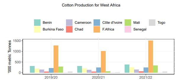 西非2021/22年度棉花產(chǎn)量較上年度增長將近47.8%。貝寧、布基納法索、喀麥隆、乍得、科特迪瓦、馬里、塞內(nèi)加爾、多哥產(chǎn)量目前都有可能超過前一年的總產(chǎn)量。雖很難知道這些產(chǎn)量數(shù)字是否會(huì)持續(xù)下去,但所有西非國家都報(bào)告正增長的事實(shí),對(duì)非洲棉花未來來說是一個(gè)令人鼓舞的跡象。