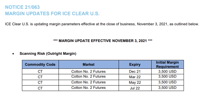外電11月3日消息,洲際交易所(Intercontinental Exchange Inc)將2021年12月、2022年3月、2022年5月、2022年7月棉花合約的初始保證金調整為3500美元。最新保證金要求于2021年11月3日收盤后生效。