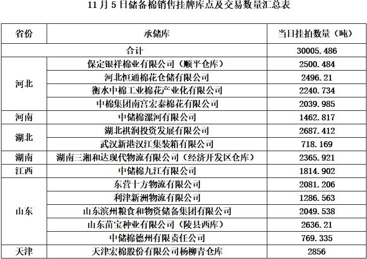 中國(guó)儲(chǔ)備棉管理有限公司定于11月5日通過(guò)全國(guó)棉花交易市場(chǎng)上市銷售中央儲(chǔ)備棉重量30005.486噸,共106捆。具體庫(kù)點(diǎn)及數(shù)量見(jiàn)下表。