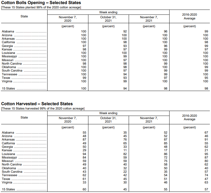 美國農(nóng)業(yè)部11月8日發(fā)布的美國棉花生長報告顯示,截至11月7日當周,美棉吐絮率為98%,前周為94%,去年同期為100%,五年均值為98%。美棉收割率為55%,前周為45%,去年同期為60%,五年均值為57%。