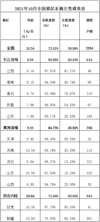 10月底,中國(guó)棉花協(xié)會(huì)棉農(nóng)分會(huì)對(duì)全國(guó)12個(gè)省市自治區(qū)及新疆生產(chǎn)建設(shè)兵團(tuán)2264個(gè)定點(diǎn)農(nóng)戶進(jìn)行棉花采摘交售情況的調(diào)查。調(diào)查結(jié)果顯示:受不利天氣影響,新疆和黃河流域棉區(qū)采摘和交售有所延后,進(jìn)度均慢于去年。截至10月31日,全國(guó)采摘進(jìn)度為72.4%,同比慢19.4個(gè)百分點(diǎn);交售進(jìn)度為58.9%,同比慢26.6百分點(diǎn)。籽棉交售價(jià)在國(guó)慶節(jié)期間持續(xù)上漲,中下旬有所回落,當(dāng)月全國(guó)棉花平均交售價(jià)10.5元/公斤,同比上漲63.7%。