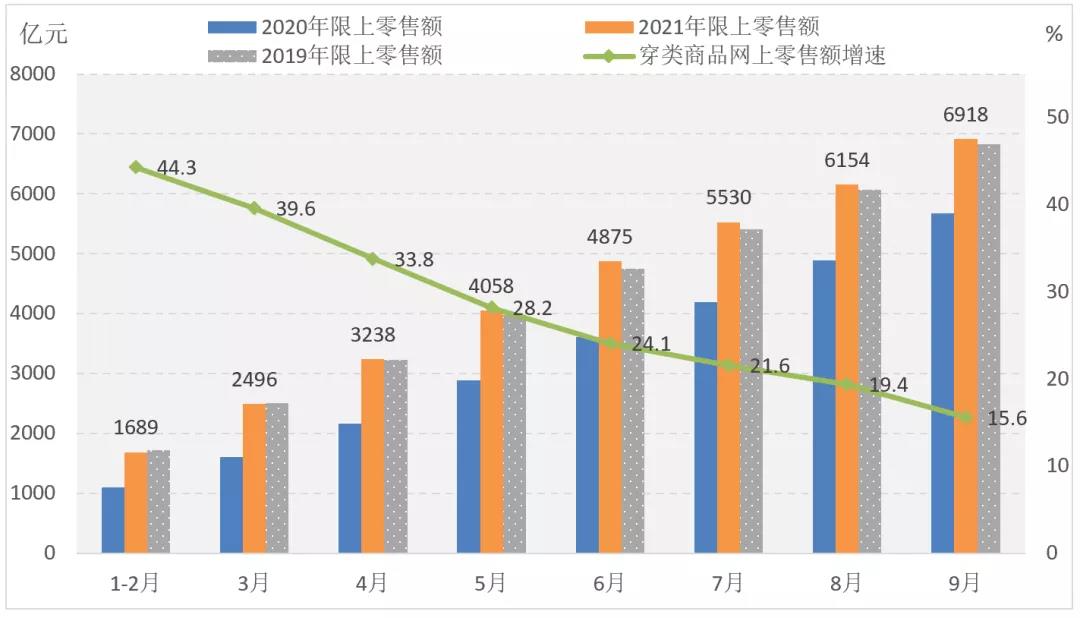 網(wǎng)絡(luò)零售增勢略好于實體,對服裝內(nèi)銷市場的拉動作用持續(xù)顯現(xiàn)。據(jù)國家統(tǒng)計局數(shù)據(jù),2021年1-9月穿類商品網(wǎng)上零售額同比增長15.6%,增速比上年同期提高12.3個百分點,比1-6月回落8.5個百分點,2年平均增長9.3%。