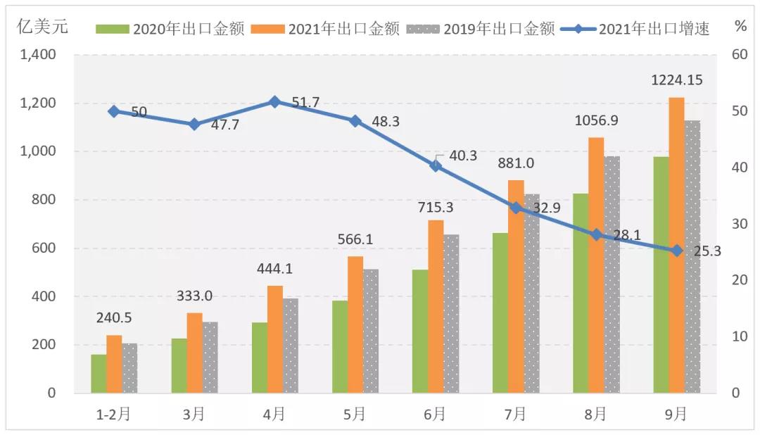 在國際市場需求回暖和海外訂單回流等因素的拉動下,憑借強韌的產(chǎn)業(yè)鏈優(yōu)勢,我國服裝出口保持大幅增長,但出口增速逐月放緩,9月單月增幅為9.9%,除上年同期基數(shù)抬高的因素,也顯示市場需求增長速度正在逐步回歸常態(tài)化。據(jù)中國海關(guān)數(shù)據(jù),2021年1-9月我國累計完成服裝及衣著附件出口1224.15億美元,同比增長25.3%,2年平均增長6.0%。從服裝出口品類看,針織服裝及衣著附件出口增長強勁,出口金額為612.23億美元,同比增長40.57%,2年平均增長7.0%;機織服裝及衣著附件出口增勢較弱,金額為501.99億美元,同比增長8.47%,2年平均微增0.28%。