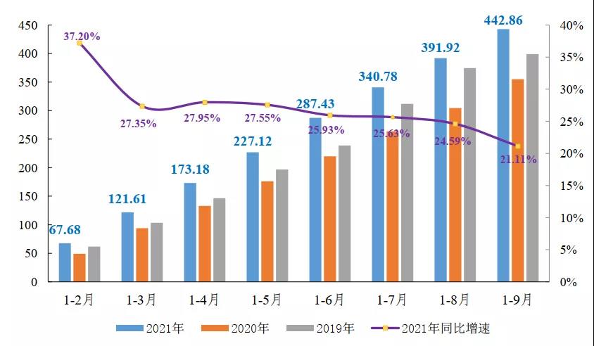 圖1 2019-2021年前3季度規(guī)上企業(yè)印染布產(chǎn)量情況