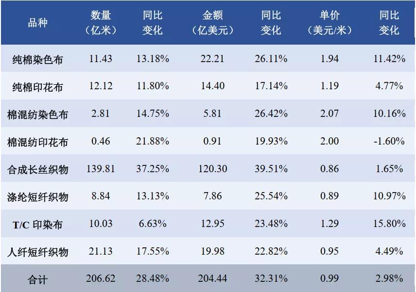 據(jù)中國海關(guān)HS8位碼統(tǒng)計(jì)數(shù)據(jù),2021年1-9月印染八大類產(chǎn)品出口數(shù)量206.62億米,同比增長28.48%,2年平均增長2.05%;出口金額204.44億美元,同比增長32.31%,2年平均增長0.74%;出口平均單價(jià)0.99美元/米,同比增長2.98%,2年平均增長-1.48%。