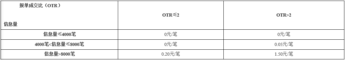 申報費(fèi)根據(jù)客戶或非期貨公司會員在合約上的報單成交比(OrdertoTradeRatio,OTR)所在區(qū)間以及信息量分梯度計算,按日收取,收費(fèi)標(biāo)準(zhǔn)具體如下: