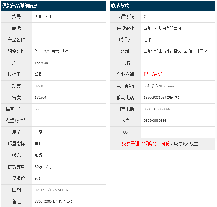 11月16日,四川玉揚紡織有限公司大化滌棉紗卡T65/C35 20x16 120x60 63" 3/1 噴氣 毛邊,報價為9.1元/米,實際成交價以協(xié)商為準(zhǔn)。[點擊查看詳情]