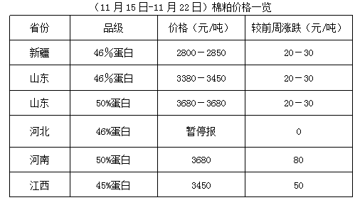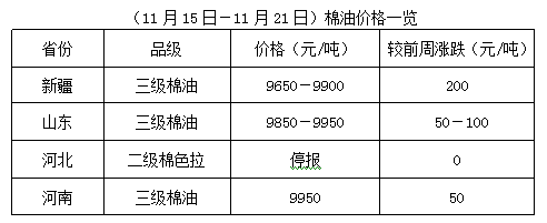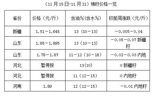 上周(11月15-21日),棉市外圍多空因素較量,豆油、豆粕期貨震蕩上行,但漲幅有限,下游需求觀望為主,棉油、棉粕成交不旺,新疆地區(qū)棉籽價(jià)格調(diào)整幅度較大,加之出疆運(yùn)費(fèi)波動(dòng),棉籽到廠報(bào)價(jià)混亂,油棉廠收購謹(jǐn)慎,開工率一般。隨著氣溫下降,新疆棉籽出疆受到一定影響,棉籽行情暫難穩(wěn)定,未來油棉廠經(jīng)營困境仍存,盈利難度將再度增加。