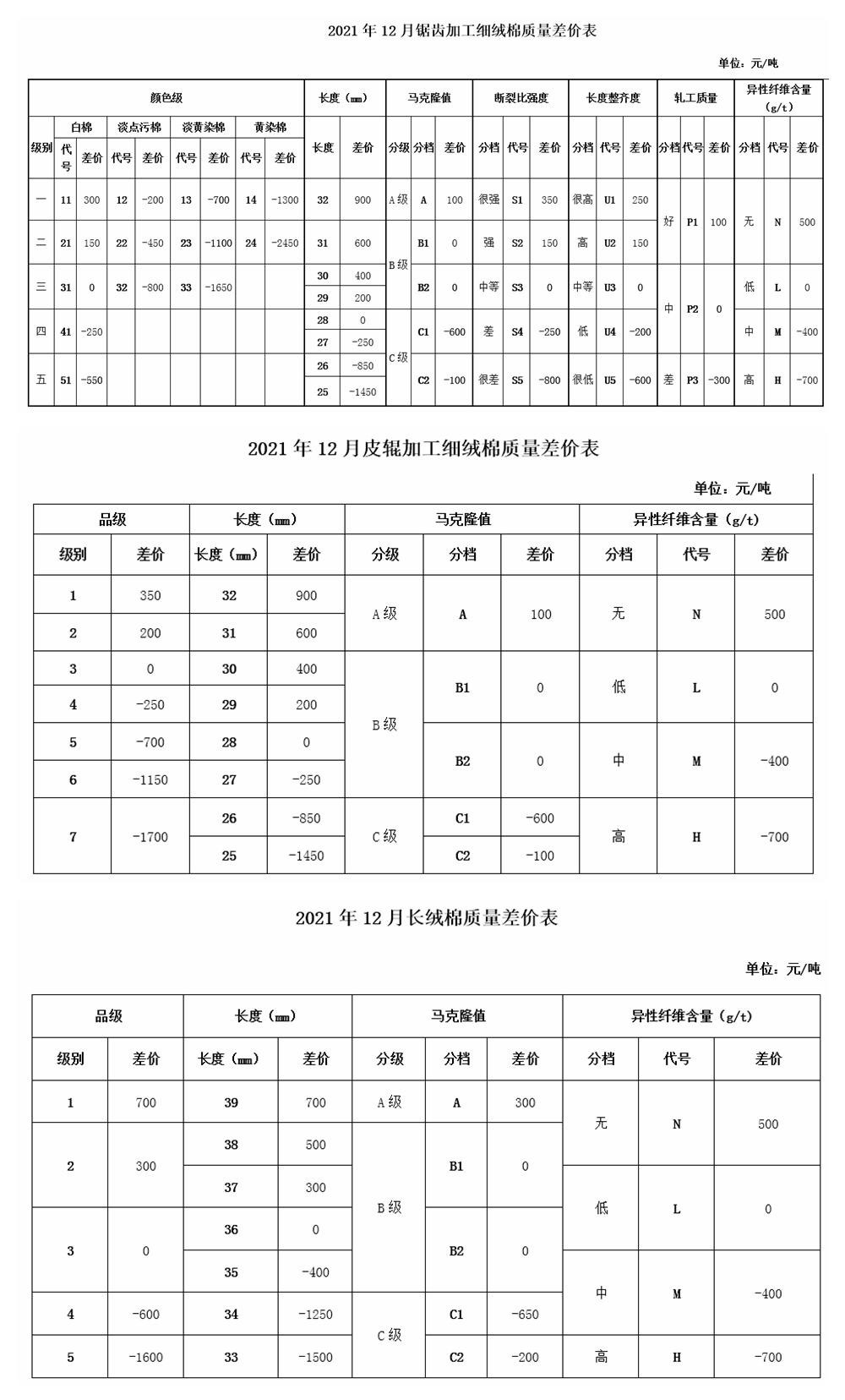 根據(jù)《中國棉花協(xié)會(huì)國產(chǎn)棉質(zhì)量差價(jià)表管理辦法》規(guī)定,現(xiàn)正式發(fā)布2021年12月《鋸齒加工細(xì)絨棉質(zhì)量差價(jià)表》、《皮輥加工細(xì)絨棉質(zhì)量差價(jià)表》和《長絨棉質(zhì)量差價(jià)表》(單位:元/噸)。