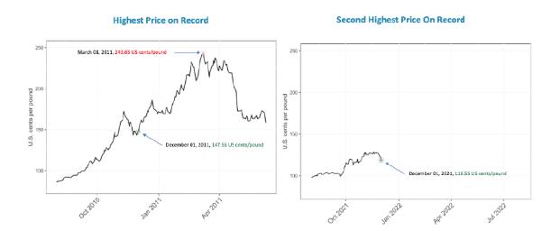 預計在2021/22年度剩余時間里,價格將出現(xiàn)波動,但不太可能攀升到比目前高很多的水平。ICAC預計,價格或者波動性不會達到2020/11年度水平,當時價格一路飆升至每磅243.65美分。