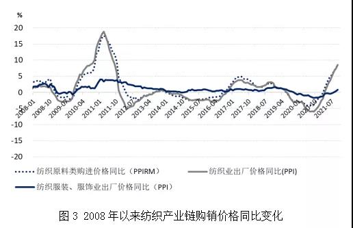 據(jù)國(guó)家統(tǒng)計(jì)局?jǐn)?shù)據(jù),2021年3月開(kāi)始產(chǎn)業(yè)鏈上下游價(jià)格變化剪刀差快速擴(kuò)大。10月紡織原料購(gòu)進(jìn)價(jià)格、紡織業(yè)出廠價(jià)格同比分別增長(zhǎng)8.7%、8.5%,終端紡織服裝、服飾業(yè)出廠價(jià)格同比僅增長(zhǎng)0.8%(圖3)。當(dāng)原料或中間產(chǎn)品價(jià)格漲幅過(guò)大,超過(guò)下游承載能力,產(chǎn)業(yè)鏈利益鏈條就有可能出現(xiàn)斷裂,據(jù)中國(guó)棉花網(wǎng)11月調(diào)查,棉紗、棉布訂單較10月減少的企業(yè)比重達(dá)66.4%、57.4%,中間環(huán)節(jié)利潤(rùn)收窄逐漸反向傳導(dǎo)。