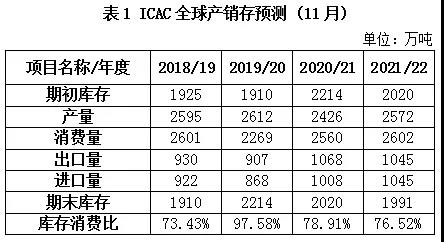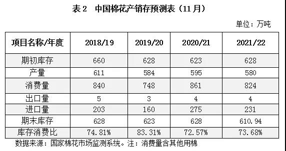 國(guó)際棉花咨詢委員會(huì)(ICAC)11月全球棉花產(chǎn)銷存預(yù)測(cè)數(shù)據(jù)顯示,2021/22年度全球棉花期初庫(kù)存2020萬(wàn)噸,同比下降194萬(wàn)噸,降幅8.76%;全球棉花產(chǎn)量2572萬(wàn)噸,同比增加146萬(wàn)噸,增幅6.02%;消費(fèi)量2602噸,同比增加42萬(wàn)噸,增幅1.64%;期末庫(kù)存1991萬(wàn)噸,同比下降29萬(wàn)噸,降幅1.44%;全球棉花產(chǎn)不足需30萬(wàn)噸,較2020/22年度收窄104萬(wàn)噸;全球棉花期末庫(kù)存消費(fèi)比為76.52%,較2020/21年度下降2.39個(gè)百分點(diǎn)。