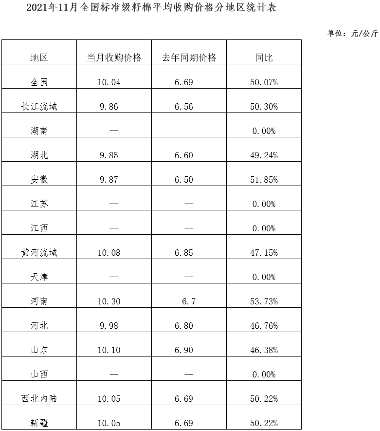 據統計,11月全國400型棉花加工企業(yè)3128級籽棉平均收購價10.0元/公斤,環(huán)比下跌4.8%,同比上漲50.1%,折皮棉價格22000元/噸左右。新疆籽棉收購價10.1元/公斤,環(huán)比下跌5.6%,同比上漲50.2%;長江流域籽棉收購價9.9元/公斤,環(huán)比上漲8.2%,同比上漲50.3%;黃河流域收購價10.1元/公斤,環(huán)比上漲1.6%,同比上漲47.2%。