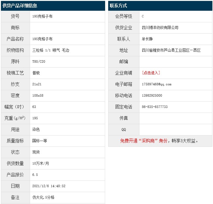 12月6日,四川博洋紡織有限公司仿大化滌棉5分三粒格T80/C20 21x21 108x58 63" 195g/㎡ 1/1 噴氣 毛邊,報(bào)價(jià)為6.5元/米,實(shí)際成交價(jià)以協(xié)商為準(zhǔn)。[點(diǎn)擊查看詳情]
