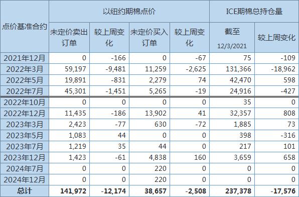 美國(guó)商品期貨交易委員會(huì)(CFTC)12月9日消息,截至12月3日,以ICE期棉2203合約點(diǎn)價(jià)未定價(jià)賣(mài)出訂單(Unfixed Call Sales)較此前一周減少9481手至59197手;以2021/22年度(8月至次年7月)合約點(diǎn)價(jià)未定價(jià)賣(mài)出訂單共124389手,環(huán)比降11929手。