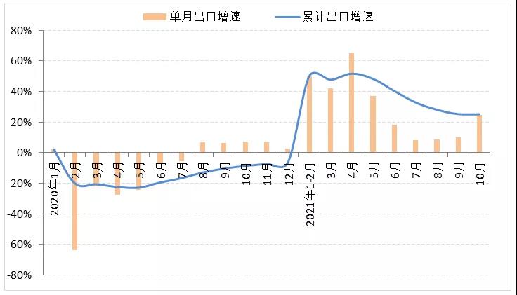 10月在國(guó)際市場(chǎng)需求增加和為圣誕季促銷備貨等因素的拉動(dòng)下,我國(guó)服裝出口增速大幅加快,單月增速比上月提高14.8個(gè)百分點(diǎn)。根據(jù)中國(guó)海關(guān)數(shù)據(jù),2021年1-10月我國(guó)累計(jì)完成服裝及衣著附件出口1388.5億美元,同比增長(zhǎng)25.2%,兩年平均增長(zhǎng)7.0%,比1-9月加快1.0個(gè)百分點(diǎn)。其中針織服裝及衣著附件出口保持迅猛增長(zhǎng),出口金額為700.74億美元,同比增長(zhǎng)40.27%,兩年平均增長(zhǎng)8.4%;機(jī)織服裝及衣著附件出口穩(wěn)步恢復(fù),出口金額為569.18億美元,同比增長(zhǎng)10.44%,兩年平均增長(zhǎng)1.54%。