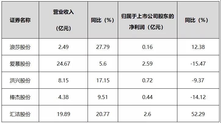 5家上市企業(yè)2021年前3季度營(yíng)業(yè)收入為59.58億元,凈利潤(rùn)6.51億元。從營(yíng)收上看,愛(ài)慕股份以24.67億元位居首位,匯潔股份19.89億元,洪興股份、棒杰股份、浪莎股份營(yíng)收在10億元以內(nèi);其中匯潔股份、浪莎股份的營(yíng)收凈利潤(rùn)實(shí)現(xiàn)雙增。