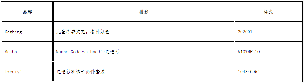 此次召回產(chǎn)品為帶帽子、領(lǐng)口拉繩、紐扣的兒童上衣。具體召回產(chǎn)品信息如下: