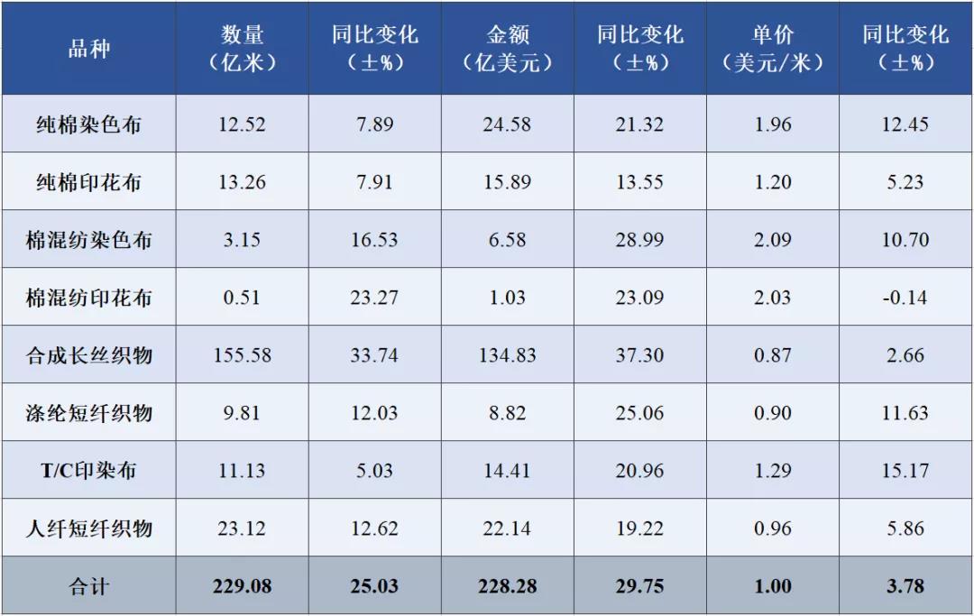 表1 2021年1-10月印染八大類產(chǎn)品出口情況