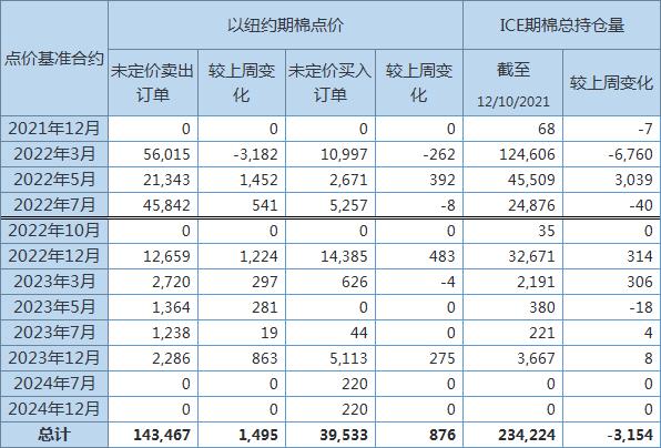 美國商品期貨交易委員會(CFTC)12月16日消息,截至12月10日,以ICE期棉2203合約點價未定價賣出訂單(Unfixed Call Sales)較此前一周減少3182手至56015手;以2021/22年度(8月至次年7月)合約點價未定價賣出訂單共123200手,環(huán)比降1189手。